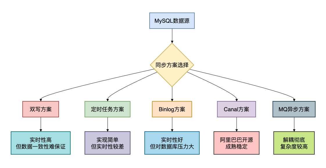 - 大数据量高实时要求:Binlog方案或Canal方案是最佳选择。