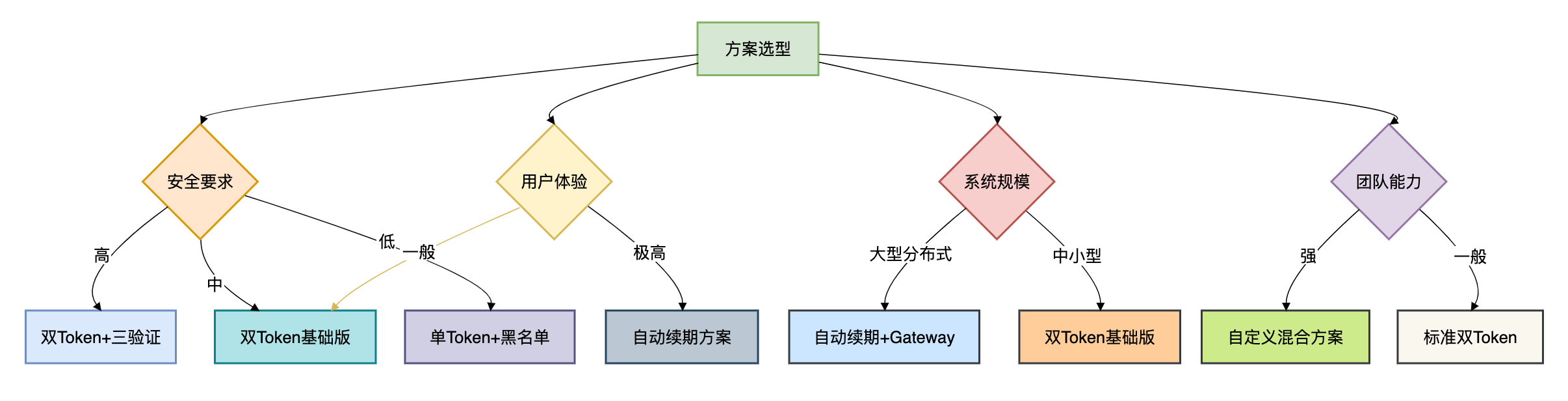 | 双Token基础版 | ★★★☆☆ | ★★★★☆ | ★★★☆☆ | 常规Web/APP | 中 | 电商平台 |