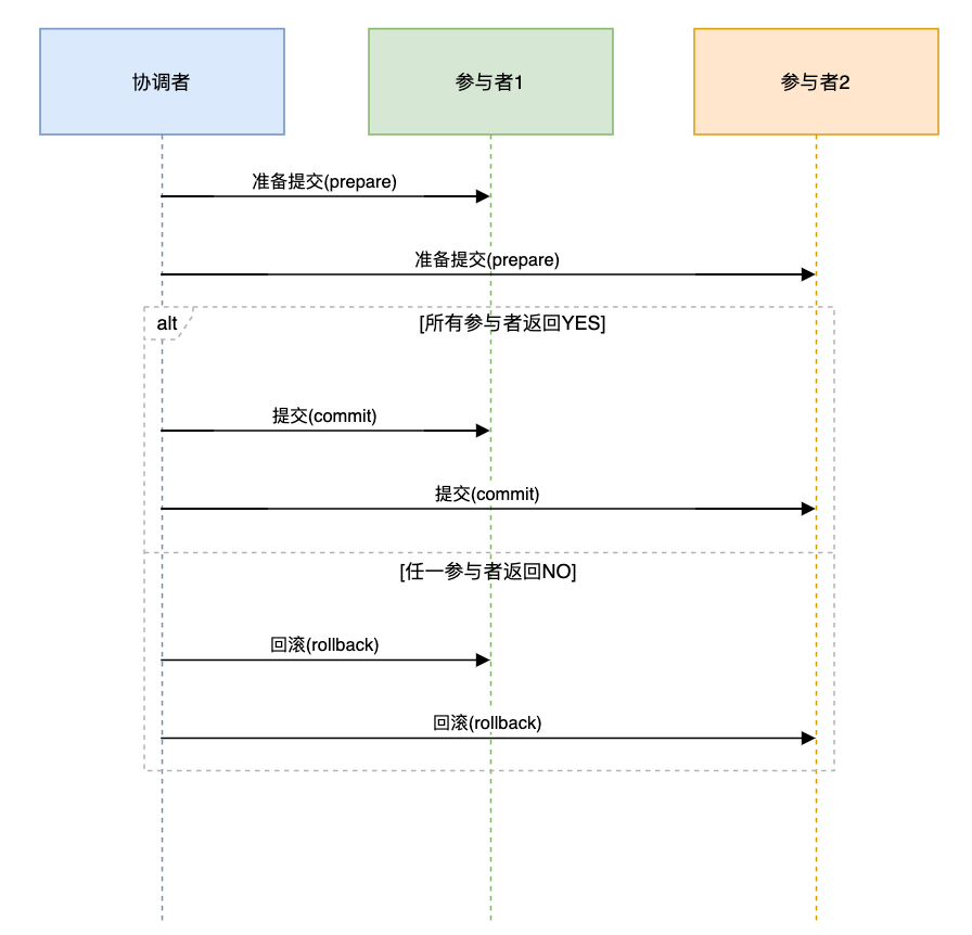 - 若有任一参与者返回NO,协调者发送rollback命令,参与者回滚事务