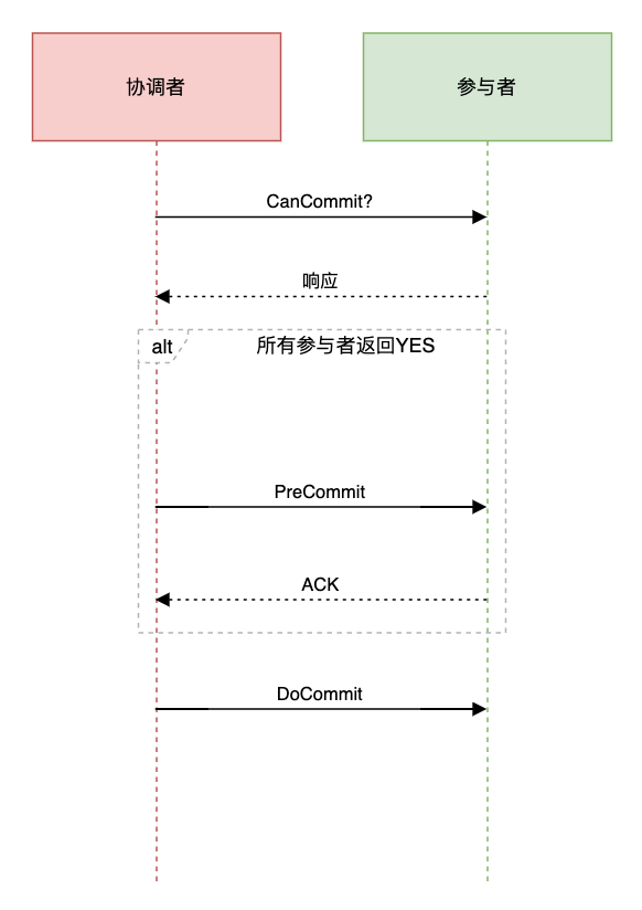 - 若所有参与者返回YES,协调者发送commit命令,参与者提交事务