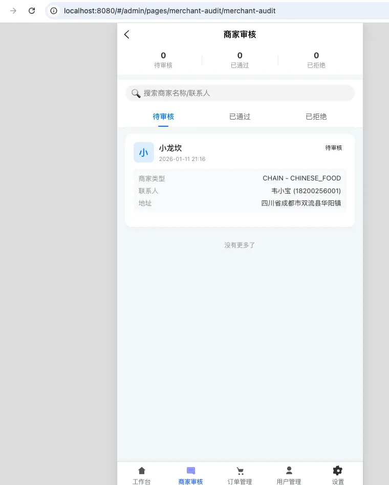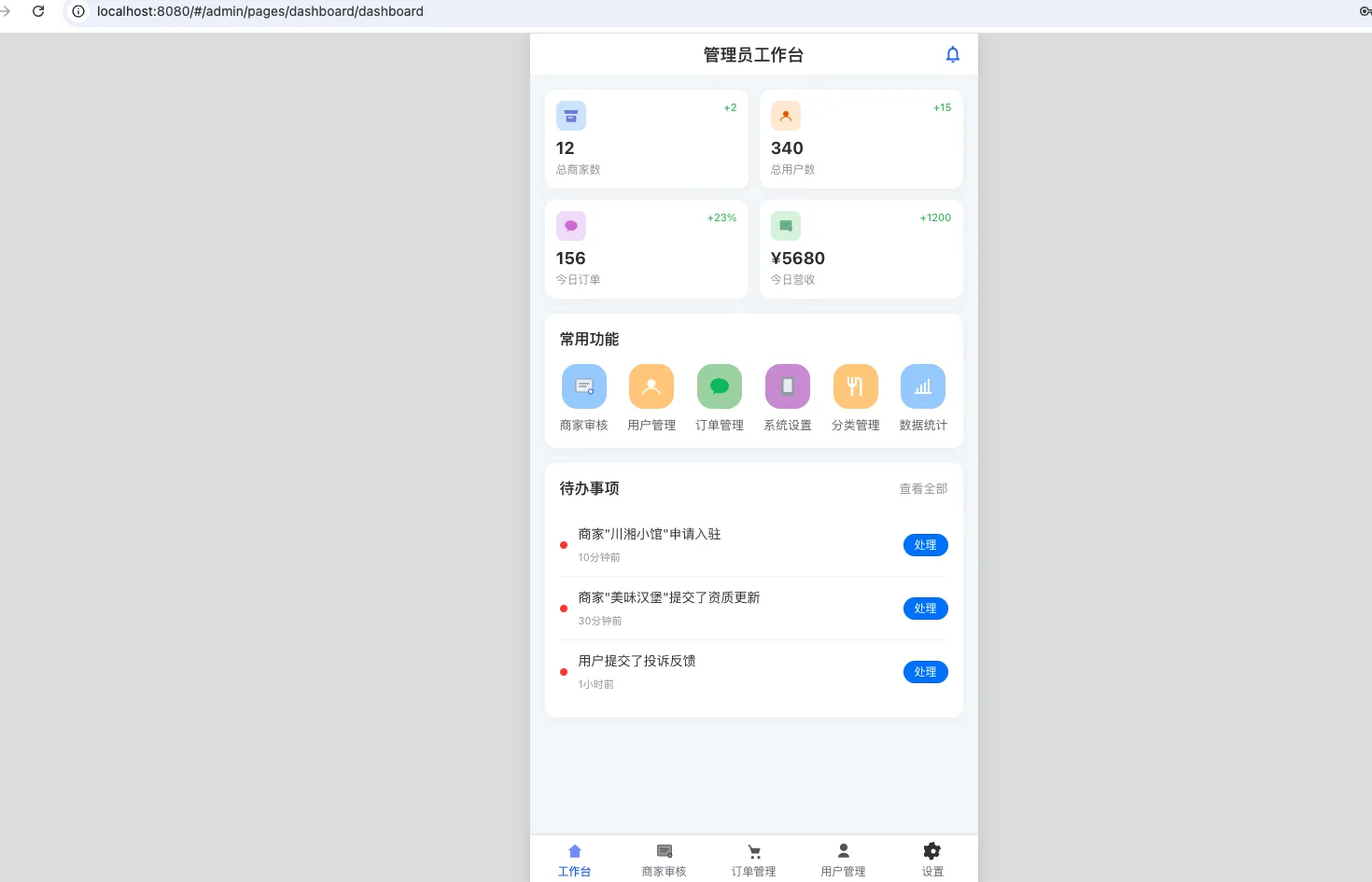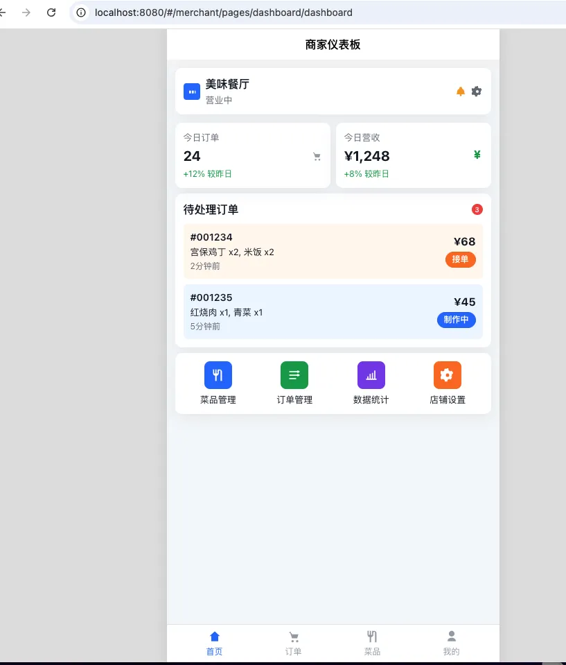 商家端的用户,可以通过手机号或者微信登录点餐后台小程序,可以看到每日用户点餐的情况,价格,收入等。 该用户还能,新增、修改或删除菜品,修改订单状态,给用户退款等。